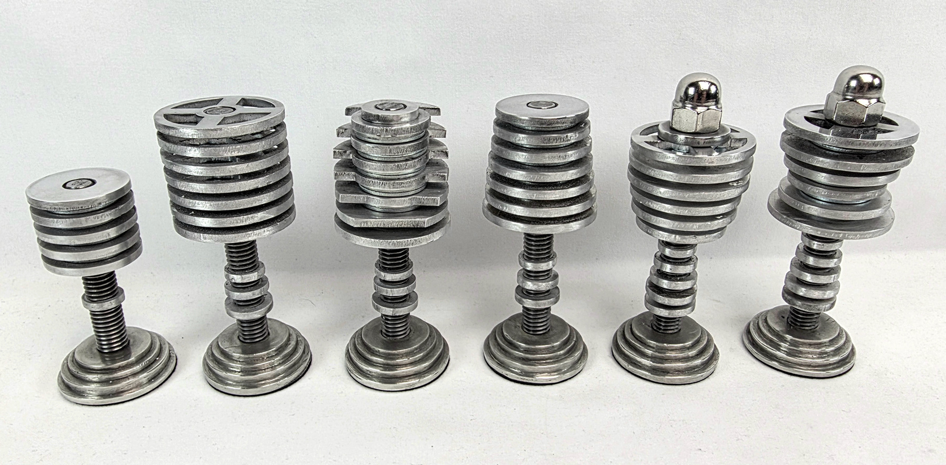 After receiving the layer parts from Send Cut Send, I hand-tapped all of them, as well as the cast bases, with a 7/16-14 spiral tap, a vice, and lots of light machine oil. This was a difficult and lengthy process, followed by many hours of sanding out imperfections, improving threads, and layering parts tightly, but I was successful. I then assembled the final pieces on threaded rod from McMaster Carr, spacing each layer out with flat washers and keeping it together with blue Loctite and a few nuts on some pieces. I finished the pieces with a fine polishing compound and a Dremel.